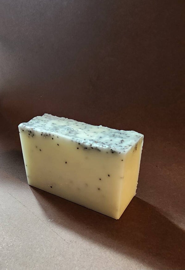 This soap is made with goats milk, essential oils, and poppy seeds.